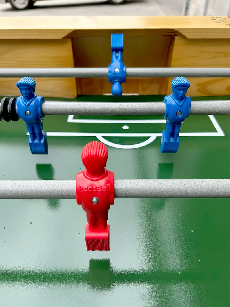 Mesa de Pebolim Luxo Mogno Embutido Bonecos Vermelho e Azul Alumínio